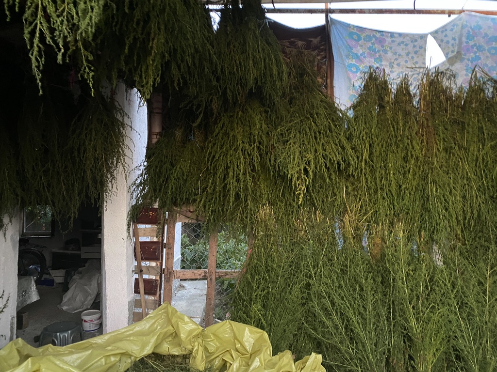 Die Artemisia Annua Pflanzen als Bündel zum Lufttrocknen gehangen. Wir produzieren nicht viel dafür aber mit großer Sorgfalt.